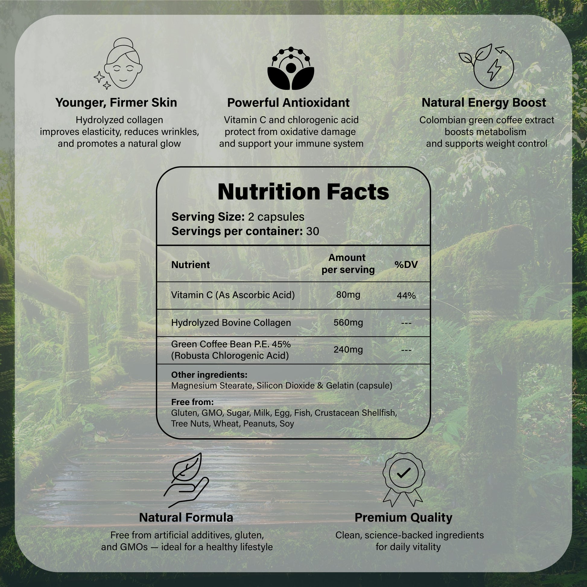 Vitamin C + green coffee help brighten skin and reduce pigmentation.